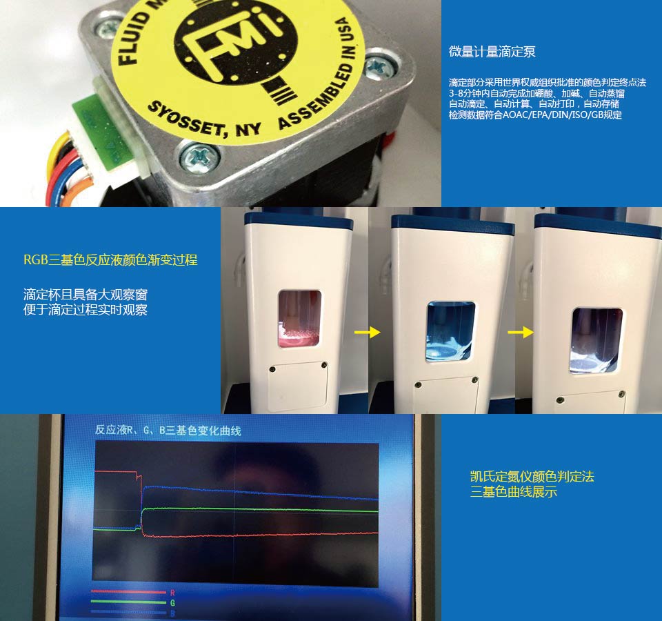 三、消解結(jié)束進(jìn)入蒸餾滴定階段(NKY6120全自動(dòng)凱氏定氮儀,采用的是邊蒸餾邊滴定同時(shí)進(jìn)行的,終點(diǎn)顏色判定法)